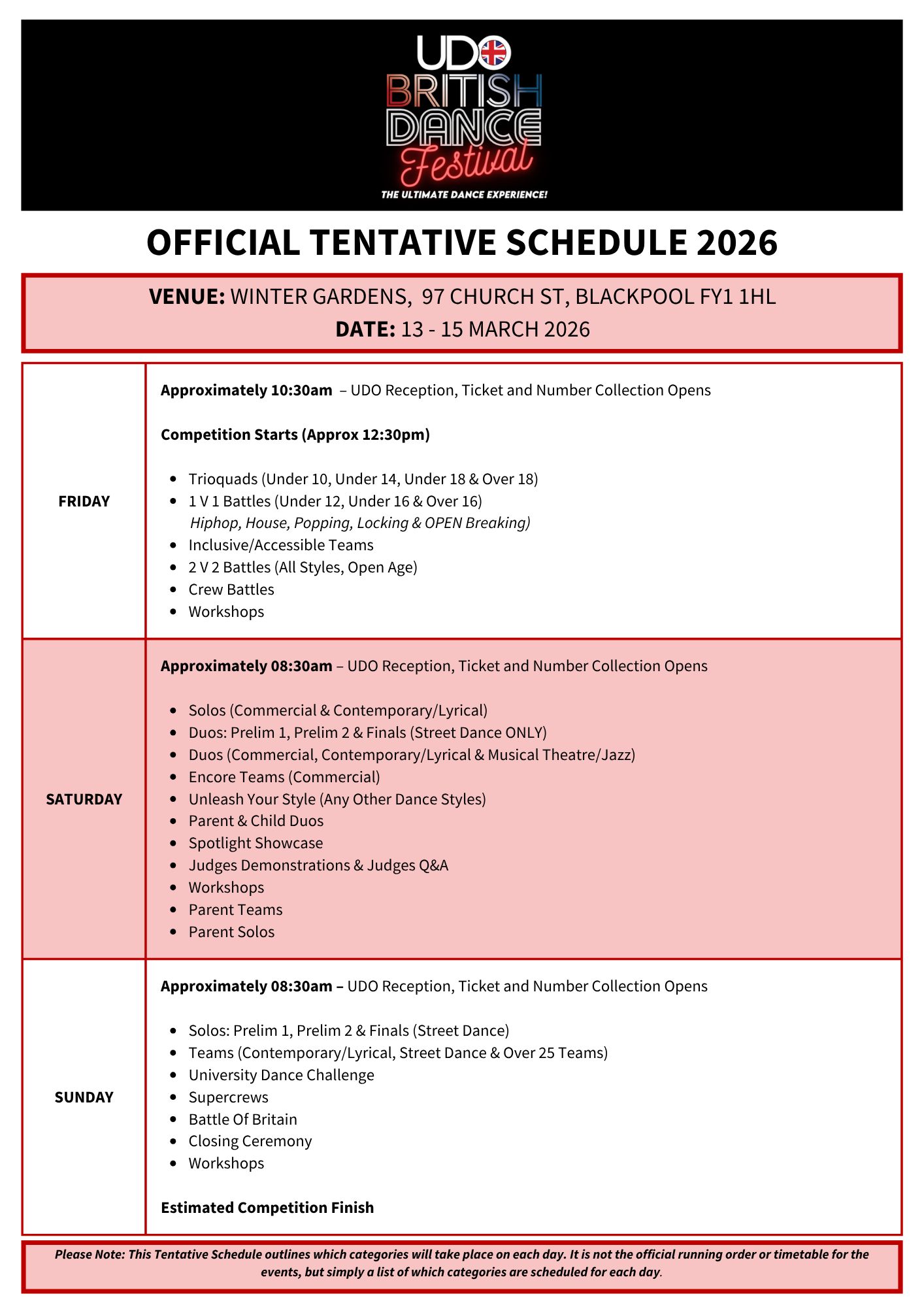 British Dance Festival 2026 is a qualifier for UDO EUROPEANS, UDO WORLDS 2026 (Street Dance ONLY) & UDO Dance Stars (ENCORE)